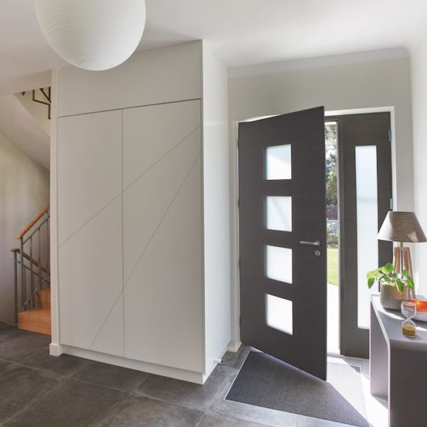 Nos portes d’entrée disposent en standard d’un ferrage de sécurité à crochets, de solides paumelles et une structure robuste du bâti. Le niveau de sécurité retardataire d’effraction peut être encore amélioré en intégrant un cylindre de sécurité, des vitrages feuilletés ou des panneaux de sécurité. Le verrouillage proprement dit de la porte d’entrée s’effectue toujours à l’aide d’une clef.